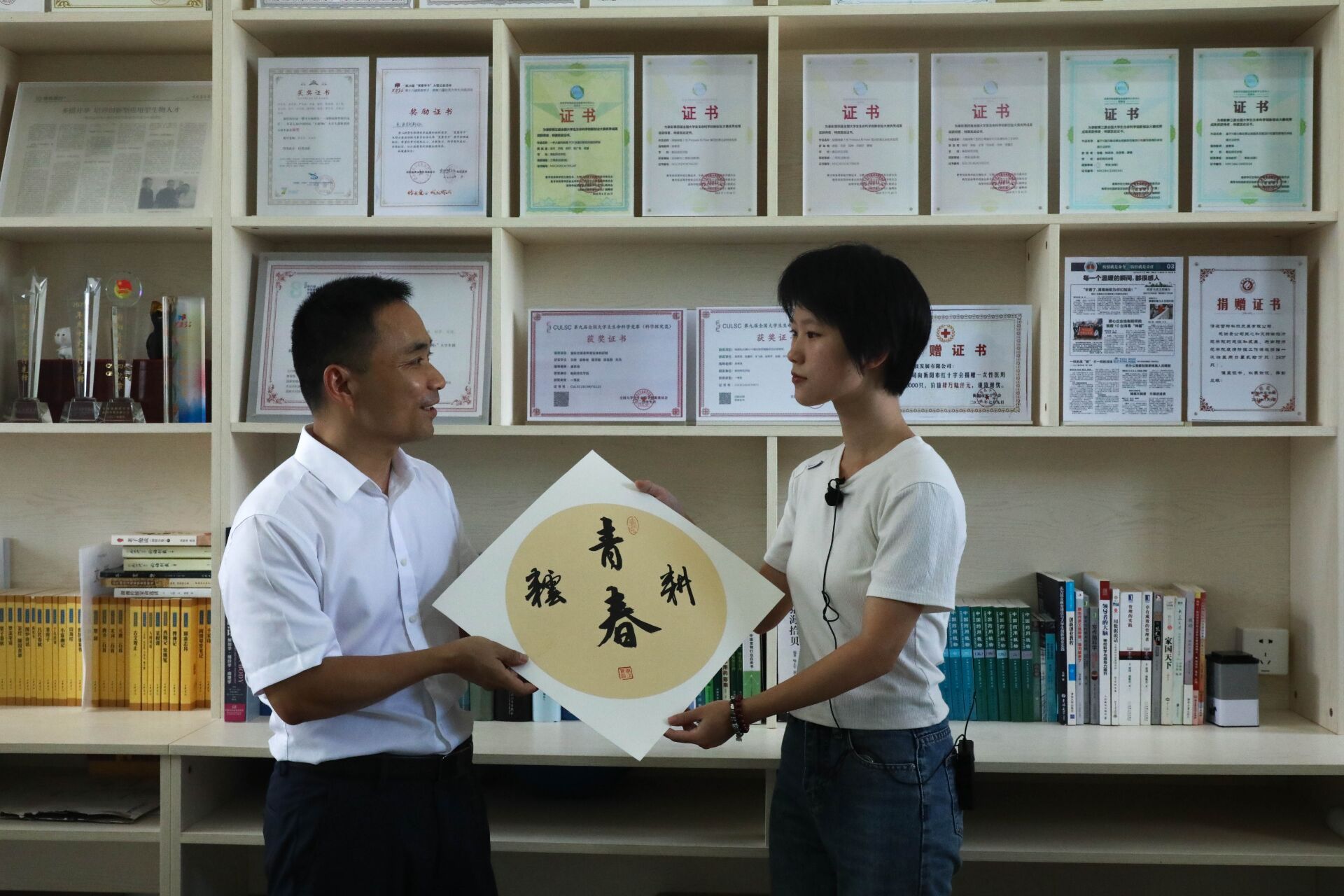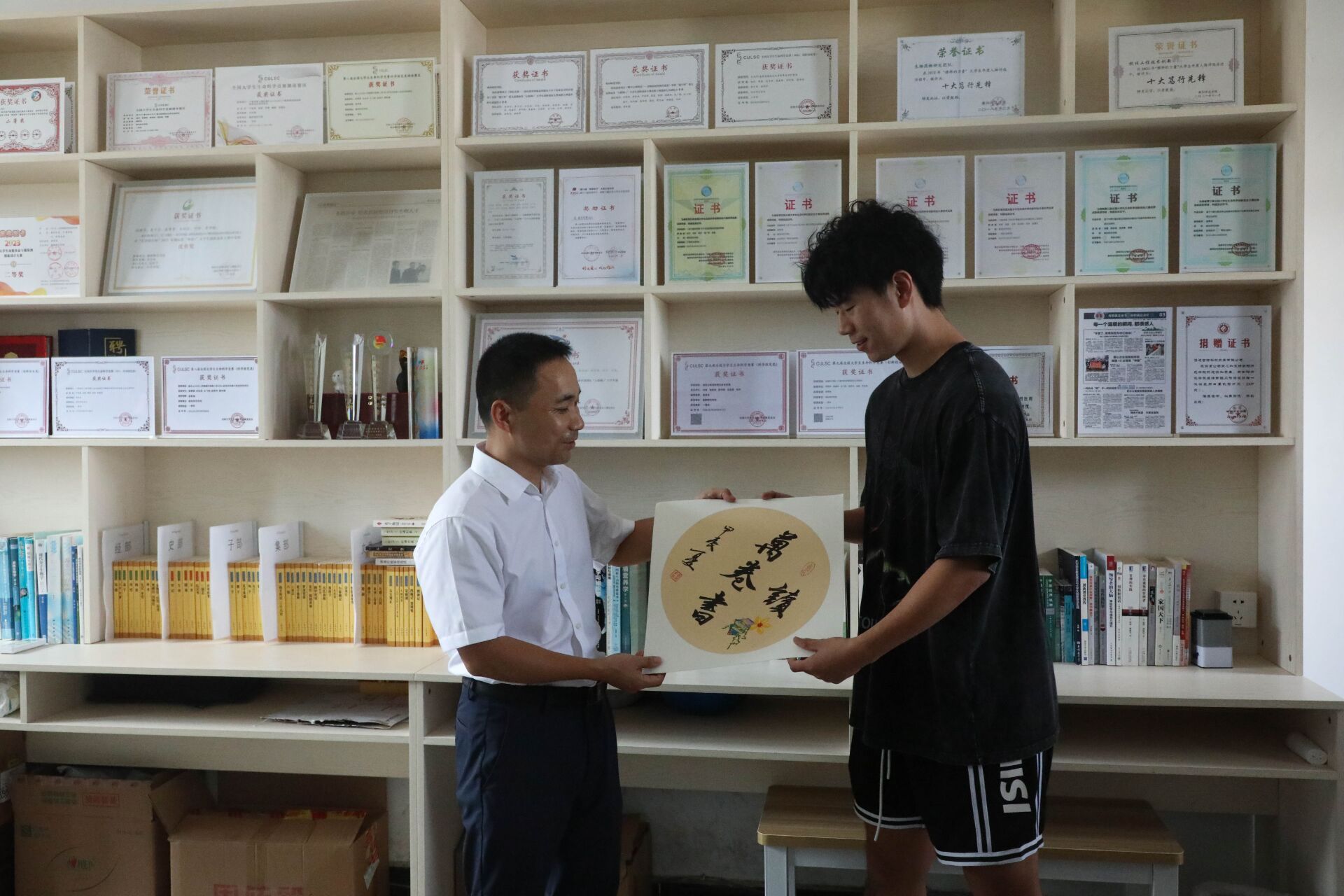 “读万卷书”——这是唐教授对生物科学专业2402班新生代乐的寄语,他鼓励代乐同学在学习专业课程的同时也要学习思想文化、艺术科学等知识,以智慧武装自己的头脑、丰富自己的生活,读万卷书让自己成为一个全面发展的有志青年。代乐同学非常感谢唐教授送予的字画,表示在今后的校园生活中努力践行唐教授读万卷书的期望。