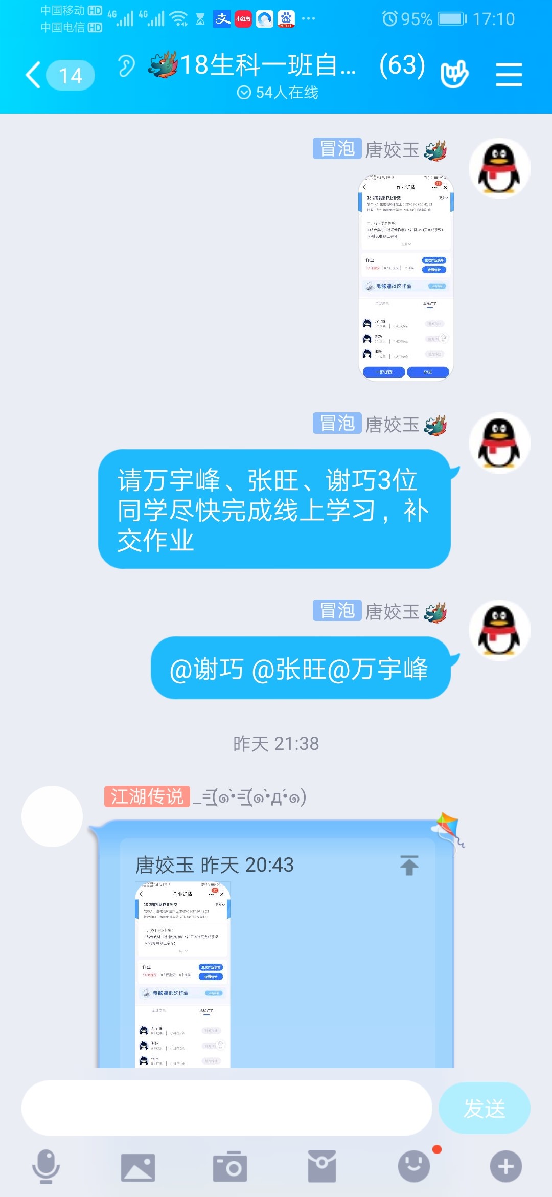 在通过“老师助手”发现未提交作业的同学后,我通过QQ群提醒未提交作业的同学补交作业,并在QQ软件上添加补交任务。仍然以3.5中第6周为例,下图为QQ群催交作业和作业补交任务添加。
