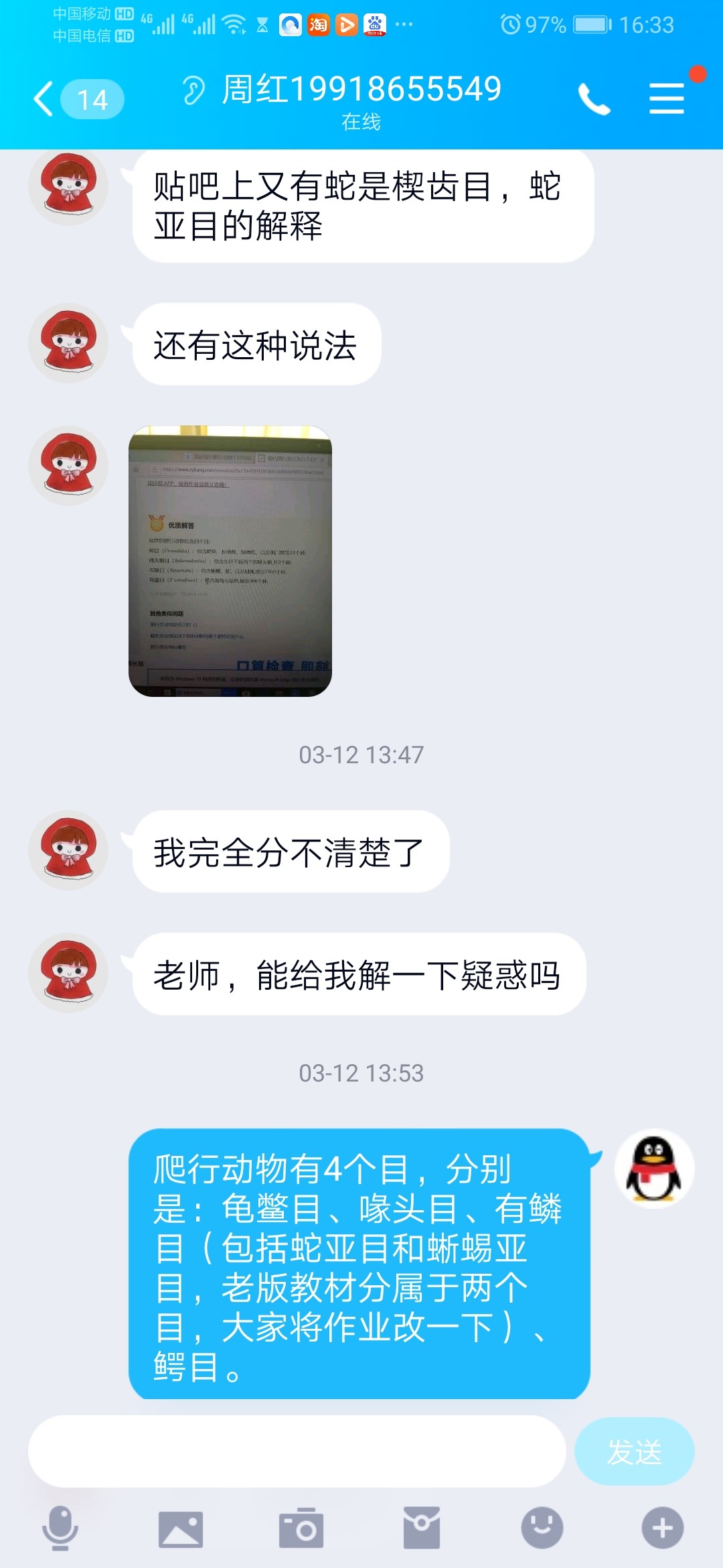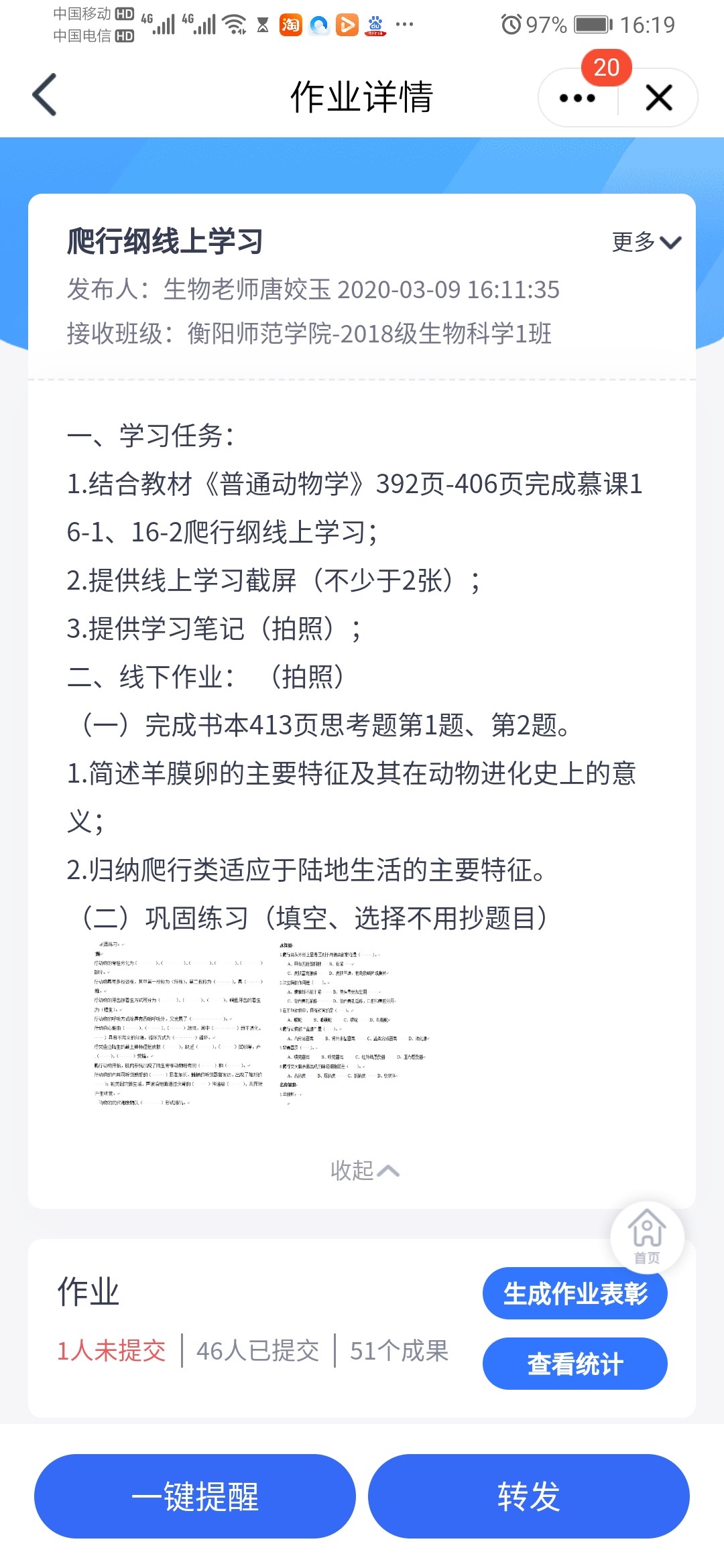 在开课的前一天通过QQ小程序“老师助手”、QQ群发布线下作业,线下作业包括书本上的思考题和老师布置的巩固性练习题。以第4周星期二慕课16-1、16-2爬行纲学习为例,我们的线下作业情况如下: