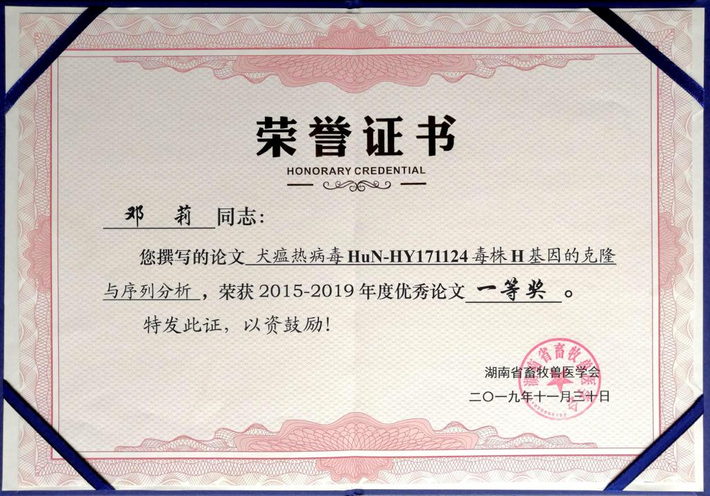 今年是新中国成立70周年,为激励大家在新的起点上取得更大进步,大会评选了2015-2019年度优秀学术论文。今年会官网2016级生物科学专业学生邓莉撰写的论文《犬瘟热病毒HuN-HY171124毒株H基因的克隆与序列分析》荣获一等奖。