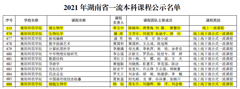湖南省教育厅于11月24日公布了2021年省级一流本科课程评审认定结果,今年会官网3门课程顺利通过评审被认定为省级一流本科课程,分别是李玉中老师负责的微生物学线上一流课程,杨灿老师负责的细胞生物学线上线下混合式一流课程以及滕涛老师负责的生物化学线上线下混合式一流课程。