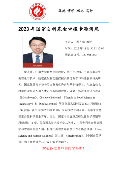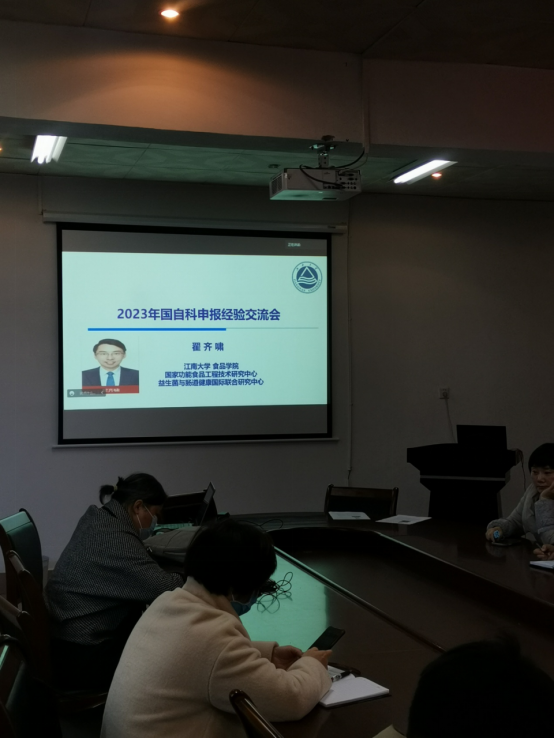 江南大学食品学院翟齐啸教授于2022年11月30日15:00通过腾讯会议的网络平台对今年会教师进行了国家自科基金申报专题讲座“肠道菌群靶向性食品的研究”。翟齐啸教授先对肠道菌群与人体健康、膳食与肠道菌群的互作、膳食调控菌群研究存在的局限性、菌群靶向性食物(MDF)的定义、菌群靶向食品的研究现状等方面做了介绍,然后提出了菌群靶向性食品的研究思路:1.基于肠道菌群体外模拟发酵;2.基于肠道菌特异基因分析;3.基于人源化动物模型体内筛选。最后,各位参会教师踊跃进行了提问和讨论。
