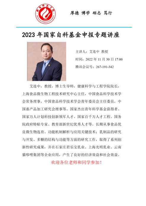 上海理工大学健康科学与工程学院院长艾连中教授于2022年11月30日17:00通过腾讯会议的网络平台对今年会教师进行了国家自科基金申报专题讲座。艾教授以国自科申报的指导思想,评审的关键点,以及标书撰写注意事项为大家做一场精彩的国自科申报讲座,会上生科学院教师进行热烈讨论。