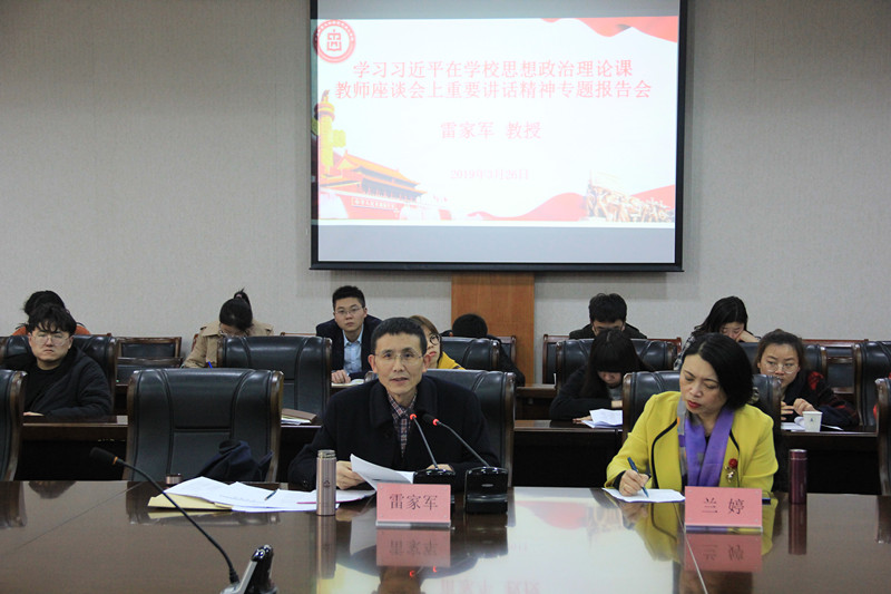 雷家军教授在讲话中指出,在座谈会上,习近平总书记采用报告和漫谈相结合的方式强调办好思想政治理论课的重要性,对学校思政理论课建设、思政理论课教师提出了明确的要求。中央召开学校思想政治理论课教师座谈会,研究讨论思想政治理论教育问题,这在党的历史上第一次,说明党和国家对思想政治理论教育十分的重视。在讲座中,雷家军教授还分享了在座谈会上所见所感,传达了习近平总书记关于建设好思想政治理论课的重要指示精神。