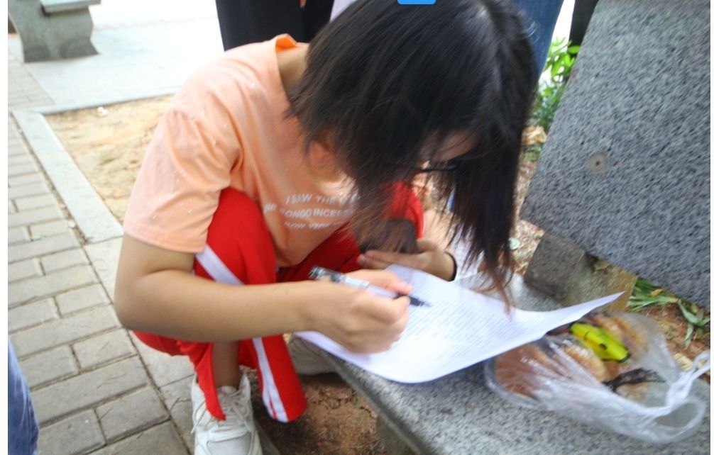 作为湖南省的卫生示范镇、美丽示范镇,洪市镇的居民们用行动诠释了对于建设美丽中国的支持。环保宣传组的志愿者们辗转来到烈士墓周围的村子里向村民们宣传环保资讯,也同时了解到国家前几年发起的“新农村建设”改造活动大大影响了村民们的生活方式。一位拿着小板凳坐在家门口的老奶奶正在乘凉,看到一群年轻人走过来,带着满脸疑惑。两名志愿者躬下腰,面带笑容询问老人年纪,并从老人口中了解这里的垃圾处理方式。她带着较浓重的方言口音向志愿者们说道,“以前大家都把垃圾丢到河里让他自己冲走,现在村里有专门自个儿雇村里的人清扫垃圾、倒垃圾,会发工资的”,志愿者们一开始稍微有点听不懂,便根据自己所理解的采用反问的方法。