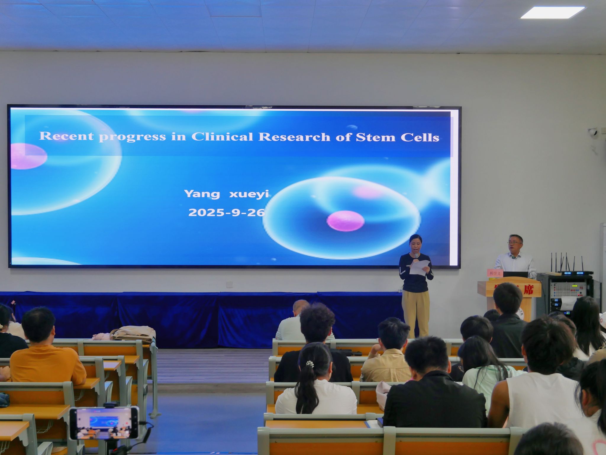 讲座伊始,杨学义教授以“什么是干细胞?”为引,与现场同学展开互动,迅速点燃学术氛围。他深入浅出地阐释了干细胞作为“万能种子”的核心特性,详细介绍了胚胎干细胞、成体干细胞以及诺奖技术诱导多能干细胞(iPSC)等不同类型干细胞的特点与优势,并重点解析了干细胞发挥治疗作用的两大核心机制,帮助师生建立起系统而深入的认识。