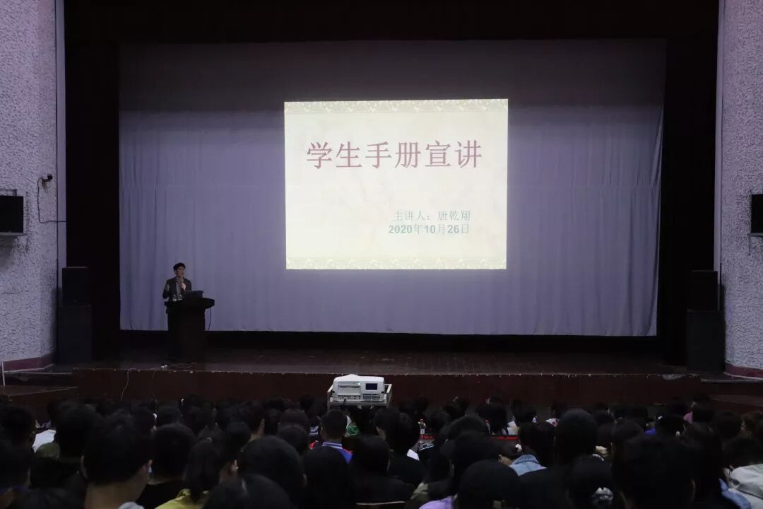 唐乾翔老师主讲《学生手册》教育讲座。他首先提出本次讲座的目的,“了解大学哪些事情该做?哪些事情不该做?”紧接着,唐老师从实践、学习、生活、奖惩四个方面带领本院学生熟悉、了解《学生手册》。老师还在讲座中特别强调了交费、请假、奖学金等方面,并指出同学们应当多看、多了解《学生手册》。现场的同学积极做笔记,对大学生活有了新的了解和规划。