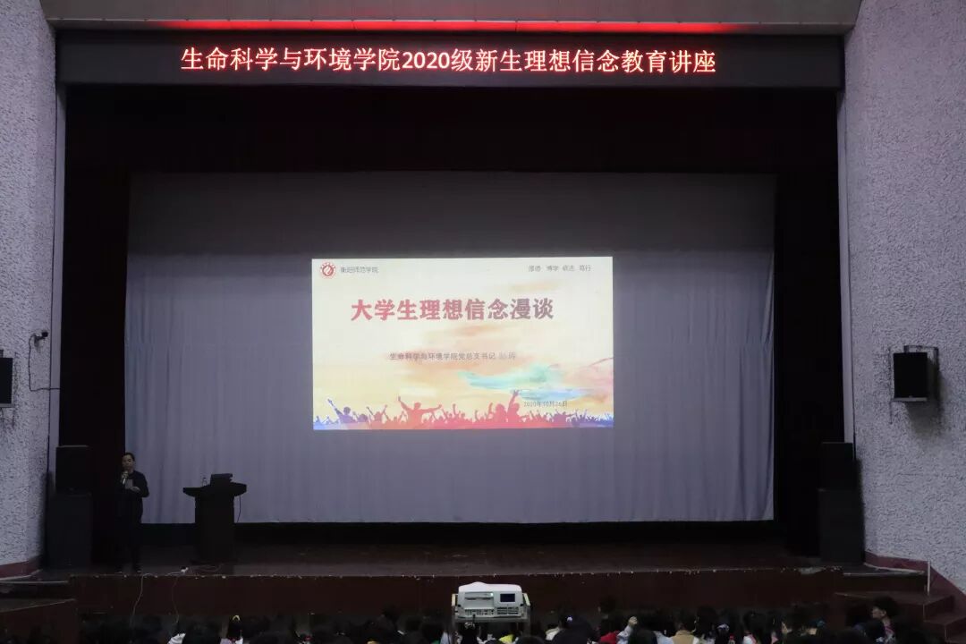 10月26日晚七点,生命科学与环境学院于西校区排演厅举办新生理想信念暨《学生手册》教育讲座。今年会官网党总支书记彭晖,辅导员老师唐乾翔任讲座主讲人。生环院20级全体学生到场聆听。