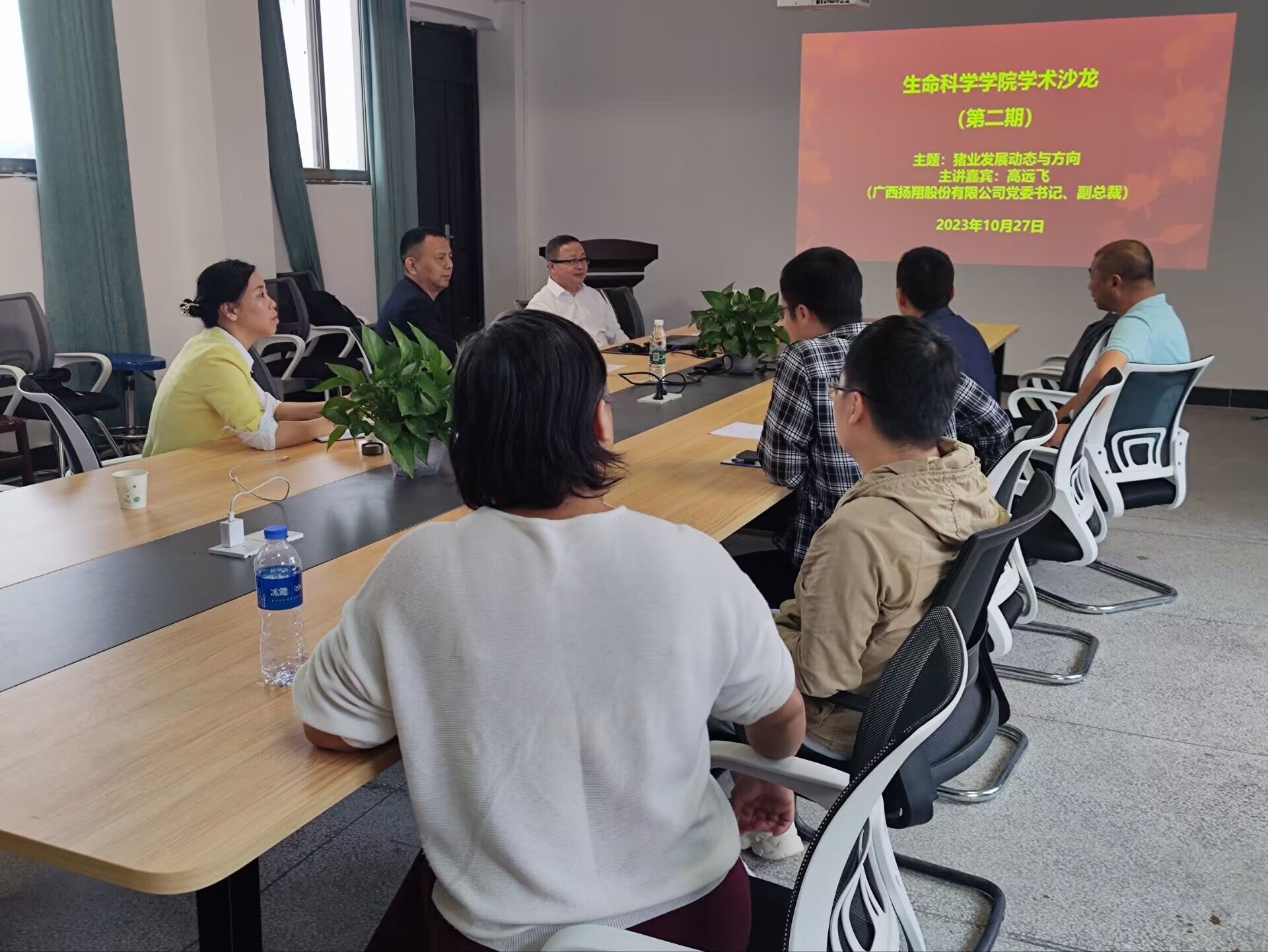 随后,高远飞总裁从中国养猪业规模化趋势、美国养猪业规模化历程、大企业对市场空间的挤占以及上市猪企2023年出栏目标对我国养猪业现状进行了具体分析。又从养猪技术进步给养猪人带来的压力、猪肉消费量的变化及中国人口基数变化等方面对我国生猪养猪未来前景进行展望。重点讲述了楼房养猪的兴起与问题,着眼于养猪业的与时俱进以及料育养宰商一体化与“城市养猪”产业新模式,努力发展现代设施养猪业,让生猪保供保得稳,为中国成为养猪强国竭尽所能。交流现场气氛十分火热,其中胡意老师咨询了当前生猪养殖的疫情问题及防治措施,最后,易诚院长就环境保护及食品加工等方面同高远飞总裁展开商谈,双方就进一步进行校企合作达成共识。