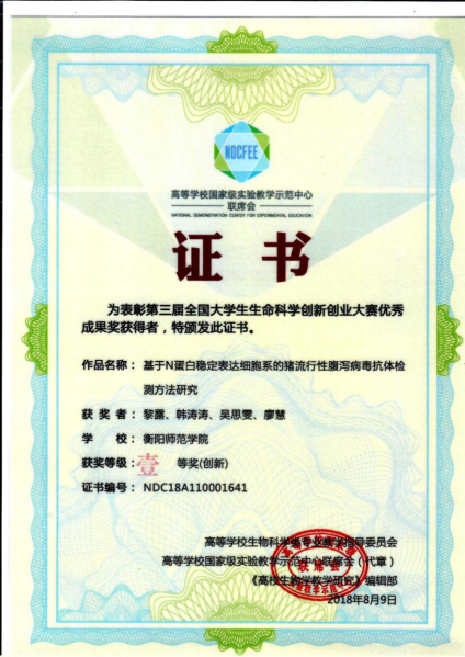 第三届全国大学生生命科学创新创业大赛获奖证书