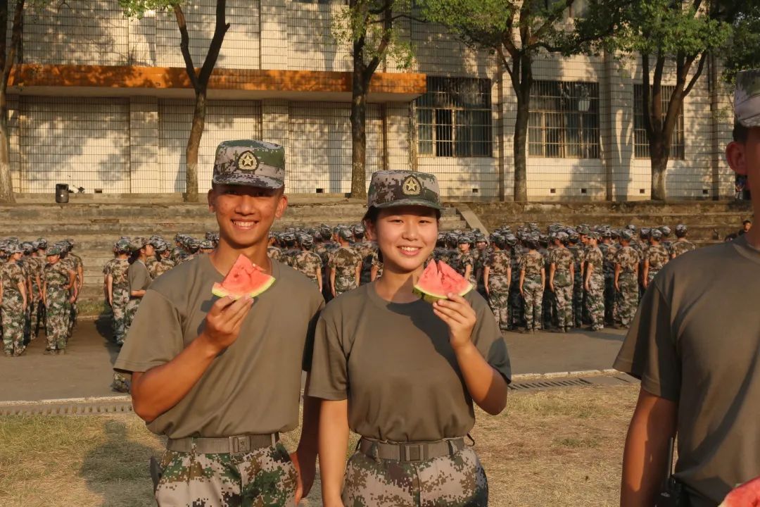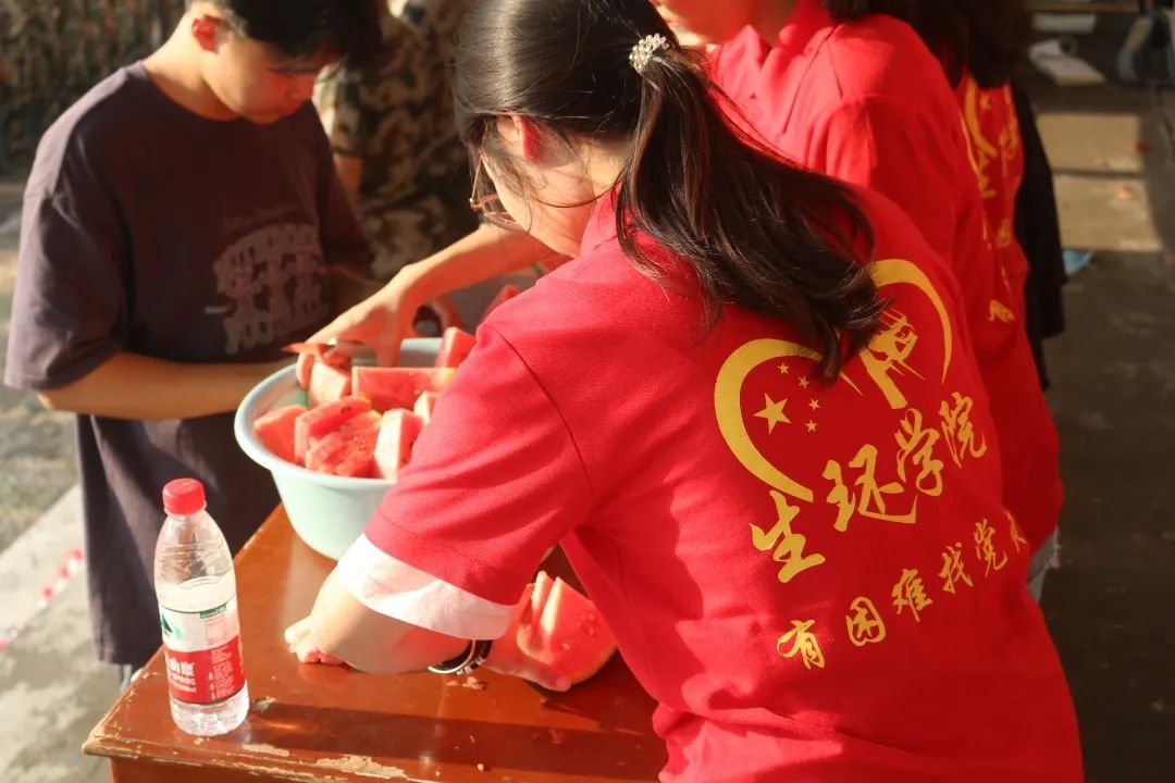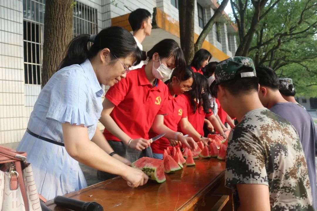 军训场地,22级新生正在紧锣密鼓地训练。党员们各司其职,配合默契,有的搬西瓜,有的切西瓜,还有的为新生递西瓜,不亦乐乎。鲜红的党旗在军训场地飘扬,鲜艳的“党员红”在军训场地穿梭。此时,党总支书记曹丽敏、副书记陈雅斐也加入“党员红”的行列,为新生切西瓜、递西瓜,确保每位新生都能吃到清凉解渴的西瓜,“党员红”成为了军训场地一道亮丽的风景线。