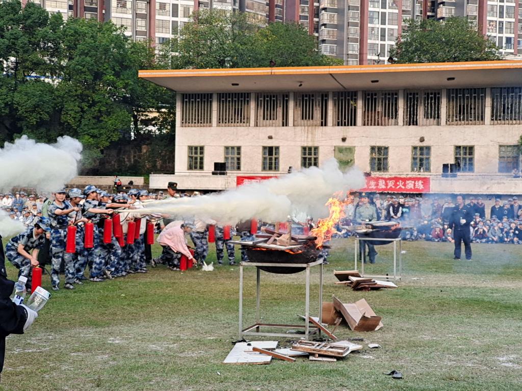 最后,教官讲解消防安全知识、并且使用标准的动作对灭火器用法进行了相应的说明。随后,同学们和教官一同使用灭火器来进行灭火,紧接着消防演练结束,各连分别带开,继续训练。