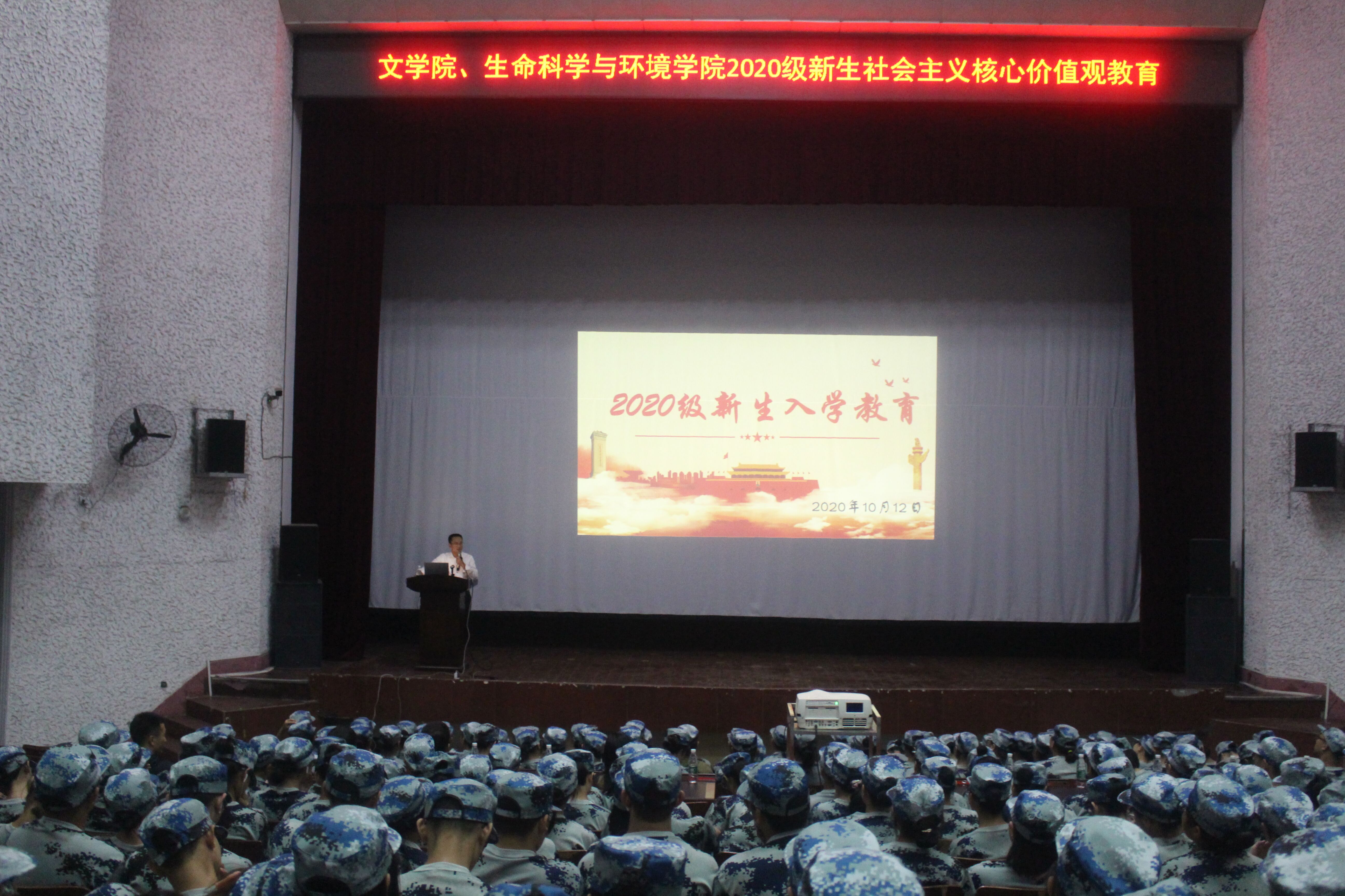 为增强学生对社会主义核心价值观的理解,加强学生思想道德建设,今年会官网与文学院于10月12日晚七点在排演厅展开了2020级新生社会主义核心价值观教育,今年会官网党总支书记彭晖、党总支副书记蒋湘祁、文学院党总支书记张云峰、党总支副书记何颖,以及双方学院的辅导员老师莅临本次会议。会议由彭晖书记主持,学生工作处处长蒋杰为主讲人。