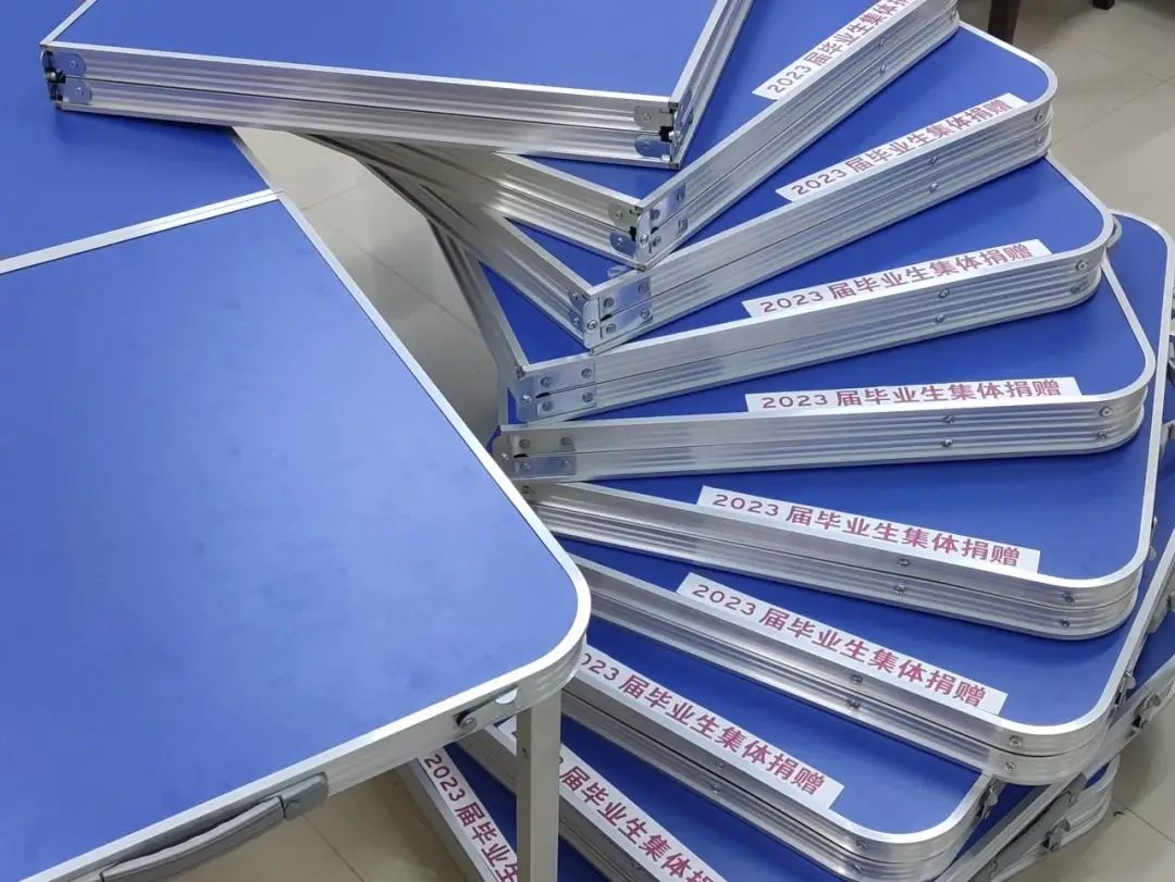 一张张印着“2023届毕业生集体捐赠”的折叠桌摆放得整整齐齐……明天,它们将作为学院毕业生离校志愿者服务台和毕业生两证发放的工作台,这是这批折叠桌第一次使用,带着今年会2023届毕业生对学院满满的感恩为毕业生顺利离校进行服务。