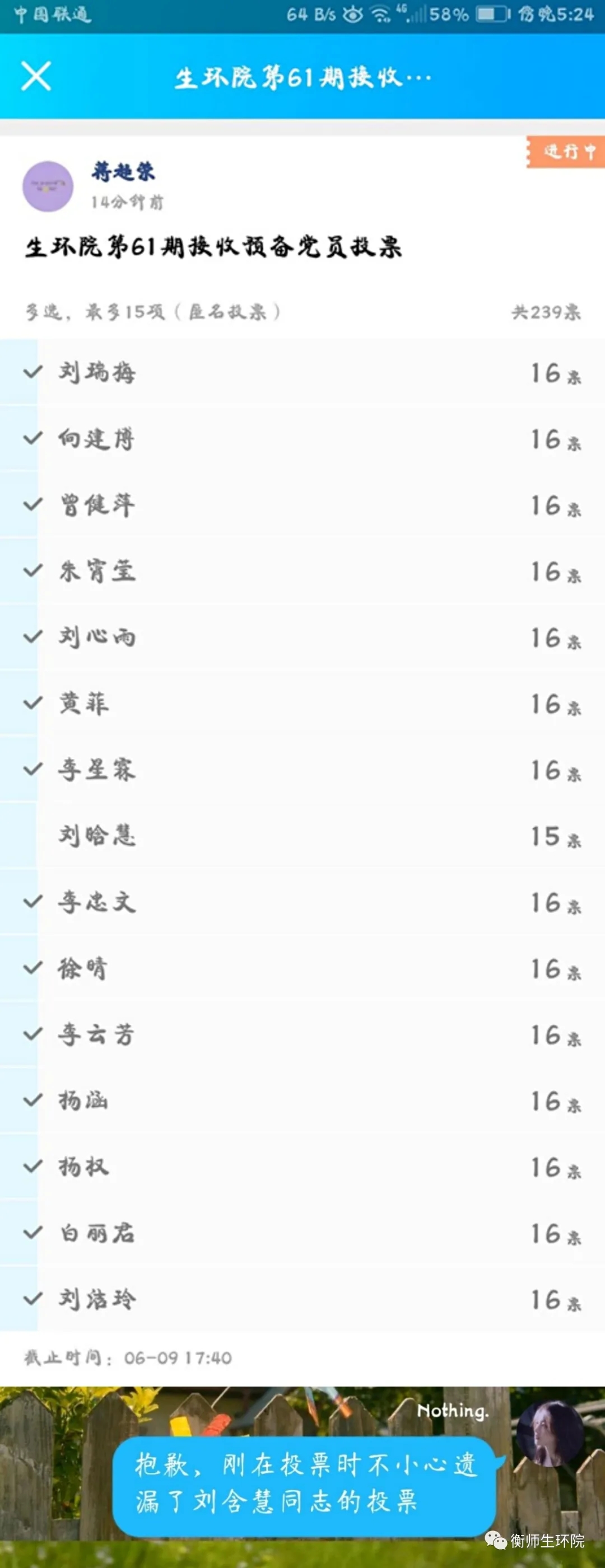 随后,这15名同志的入党介绍人就以上15名同志的表现进行了汇报和讨论,彭晖书记认为李星霖同志工作扎实,团结群众。他对李星霖同志转为预备党员表示支持,同时希望她可以加强政治理论学习,更加有责任担当。黄菲同志的介绍人罗远来说,“因为黄菲是我所在班级的班导,因此对她十分了解。对待工作黄菲同志认真负责,课外积极参与了环保志愿与三下乡活动,科研活动上也有成果,我认为她达到了党员的标准。”经过各位正式党员的讨论,通过采取线上匿名投票的方式,最后,李星霖、黄菲等15位新发展党员以16票赞成,0反对,0票弃权顺利转为预备党员。
