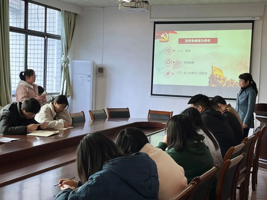 曹书记首先介绍了二十大主题,接着分别介绍了“三个务必”“十年来三件大事”“跳出历史周期律的第二个答案”“党的中心任务”“中国式现代化的五个特色”“中国式现代化的本质要求”,使党员们深刻意识到坚定正确政治方向、理想信念的重要性。在讲座过程中,曹书记向党员们提问:“如何争做有为青年?”江娅从学习、科技创新和为人民服务三个方面讲述如何做有为青年。周雅琳认为:首先要秉持全心全意为人民服务的宗旨;其次要认真学习,努力钻研专业知识最后要做到知行合一,不断创新,敢于实践。