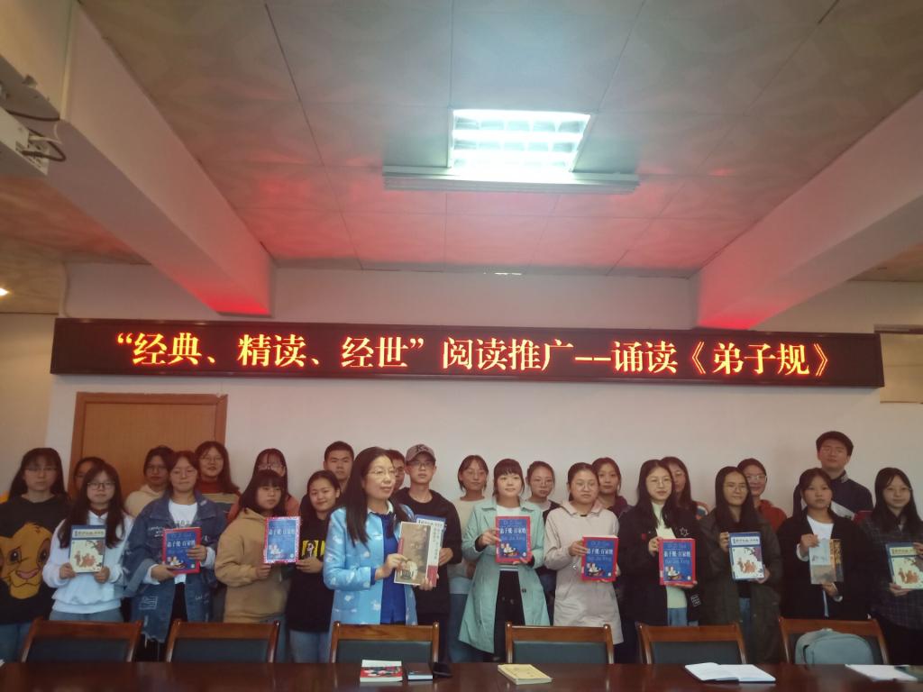最后,为激发带动同学们的阅读积极性,今年会官网党总支副书记蒋湘祁带领师生共同诵读《弟子规》。同学们个个情感饱满,慷慨昂扬地朗诵,沉浸在经典的国学故事中。师生的热情活力与书籍中的古色古香发生了激烈的碰撞,并巧妙地融合在了一起。在朗朗书声与墨香书韵中,想必同学们对“经典”有了更深刻的了解。
