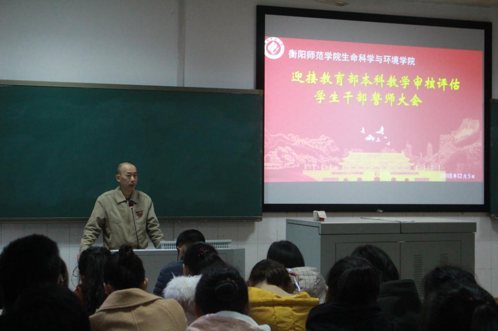 首先,由刘艳波书记为学生干部迎接评估工作布局作出总指示。他指出审核评估是与我们每个人息息相关,紧密相连的工作,在12月10日-13日我们将迎来正式的为期四天的审核评估,到了“争光争气争成绩”的紧要关头,做好这项工作是生环学子义不容辞的责任,人人应有参与评估的紧迫感与责任感。尤其是在座的学生干部——生环院学生的脊梁,理应起带头模范作用,起表率作用,传播积极向上的精神,带领同学们在评估专家面前,展现出衡师人积极的精神风貌。